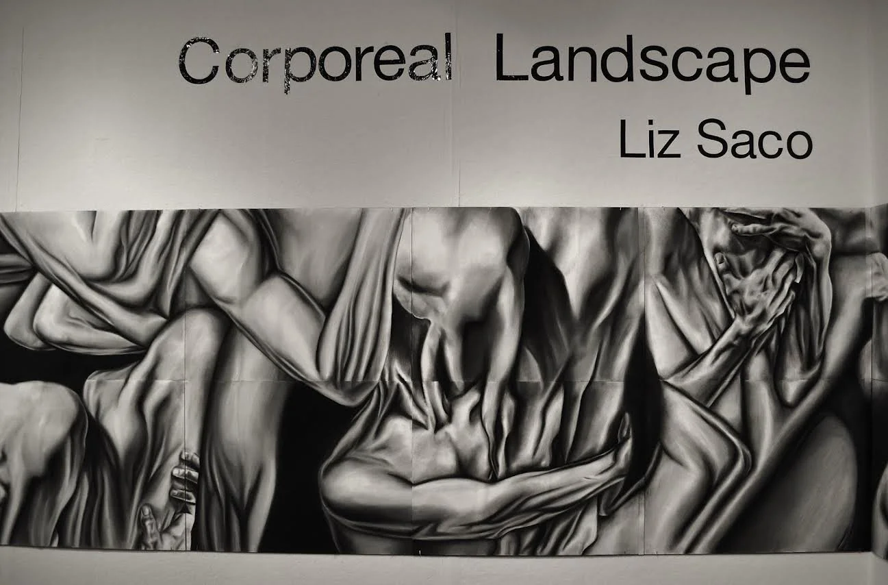 Though based on the same subject, there are clear differences between the works. Technically, the drawings were created using black charcoal to create shadows and the values in between. The paintings in Corporeal Landscape II use a dark ground made by applying multiple layers of black gesso and then bringing the highlights out of the shadows. Another difference is the amount of exaggeration in the figures overall. Both works employ enlargements of the figure, however in the paintings there is more exaggeration of the figures and body parts as well as increased focus on detail that is also exaggerated. Foulks in a written statement explained her intention; “Corporeal Landscape II examines the disorienting experience of shifting familiar sights into otherworldly contexts. Using the most familiar and personal of forms – the human body – as a source of manipulation, this large piece plays with the viewer’s eye through surprising transformations of arms, legs, fingers, and other bodily forms.” In discussing her use of exaggeration she writes: “Calves morph into collarbones, elbows into knees, thighs into forearms. Thickly-contrasted tendons and ligaments – some anatomically fictional – produce a deeply graphic quality. Empty voids engulf portions of the body, yielding a surreal push-and-pull effect. Overall, this bodily landscape coaxes viewers to decide what they perceive as real and unreal.” Corporeal Landscape II is a powerful work that will engage the viewer on multiple levels that include rigorous realism, emotional intensity and intricate compositional vitality.