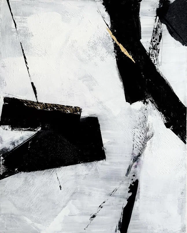 Izu’s mixed-media approach starts with acrylic paint on heavyweight paper or canvas, often paired with a technique loosely inspired by monotype printing to create additional textures and patterns. Tapping into her childhood fondness for paper crafts, she also incorporates specialty papers (predominantly washi) for layers and depth, and gold as signature marks.