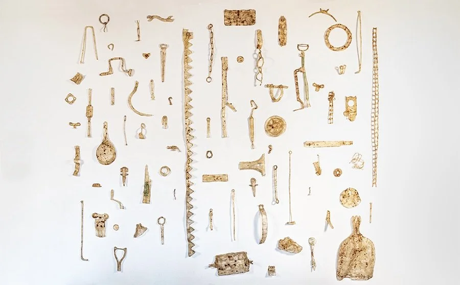 Pat Hickman grew up on the flatlands of northeastern Colorado and thought that she had left for good after completing her college education. In 2021 Hickman participated in an artist residency in Kansas and the experience of being surrounded by the Great Plains rekindled memories of the relentless blowing wind; place and family history surfaced. Discovering a collection of old rusty tools, a body of work began to take shape. Hickman's experience reminded her of a quote by Gertrude Stein; “What good are roots if you can’t take them with you?”